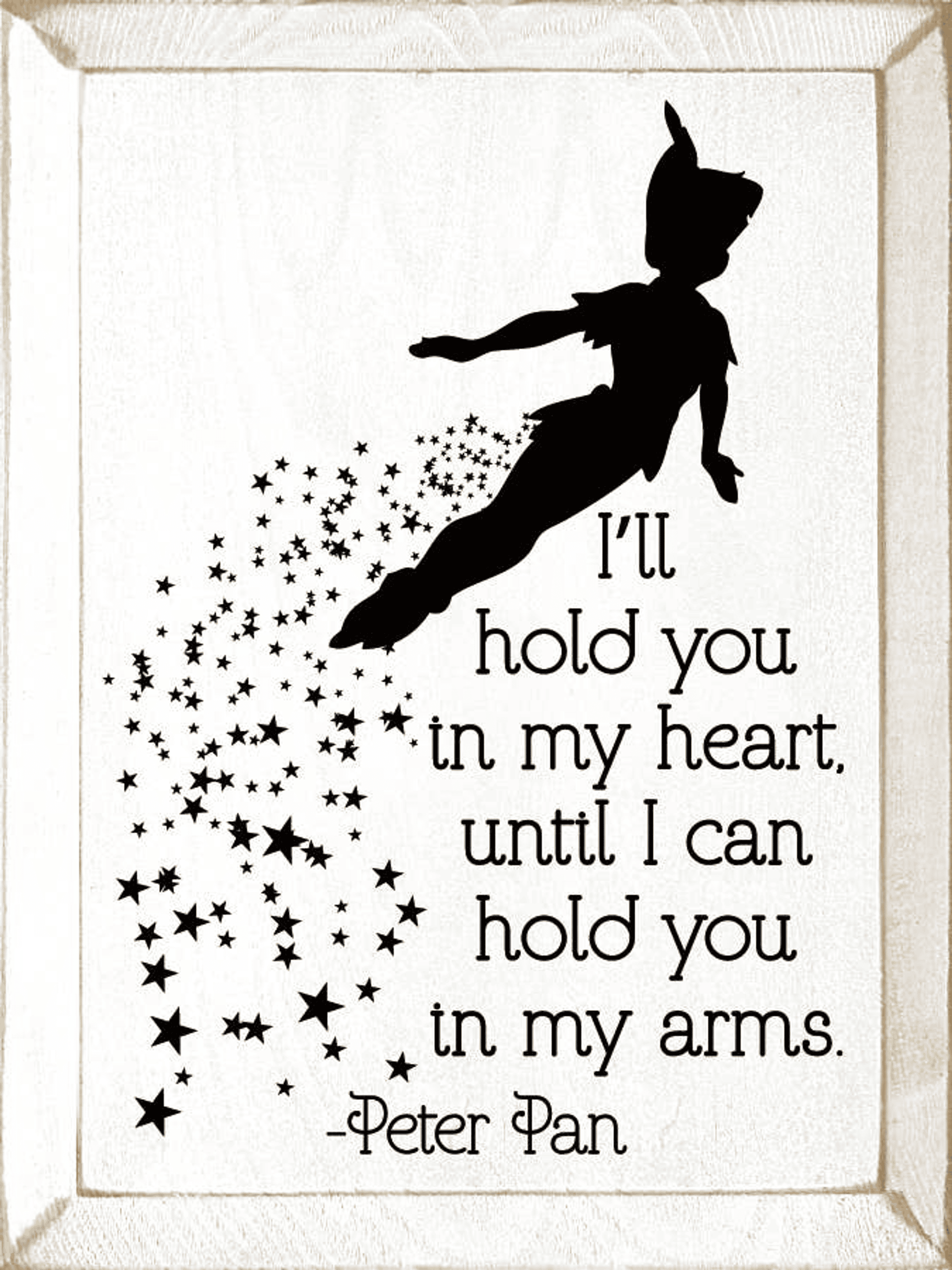 I'll Hold You In My Heart, Until I Can Hold You In My Arms. - Peter PanOur pieces are made from solid knotty pine, so please allow for slight imperfections - as wood is imperfect by its nature - but only adds to the character of the product. It is intended to have a rustic, old look and feel. Expect knots, variance in color, and natural cracks - as well as small edge "dents" or chips.