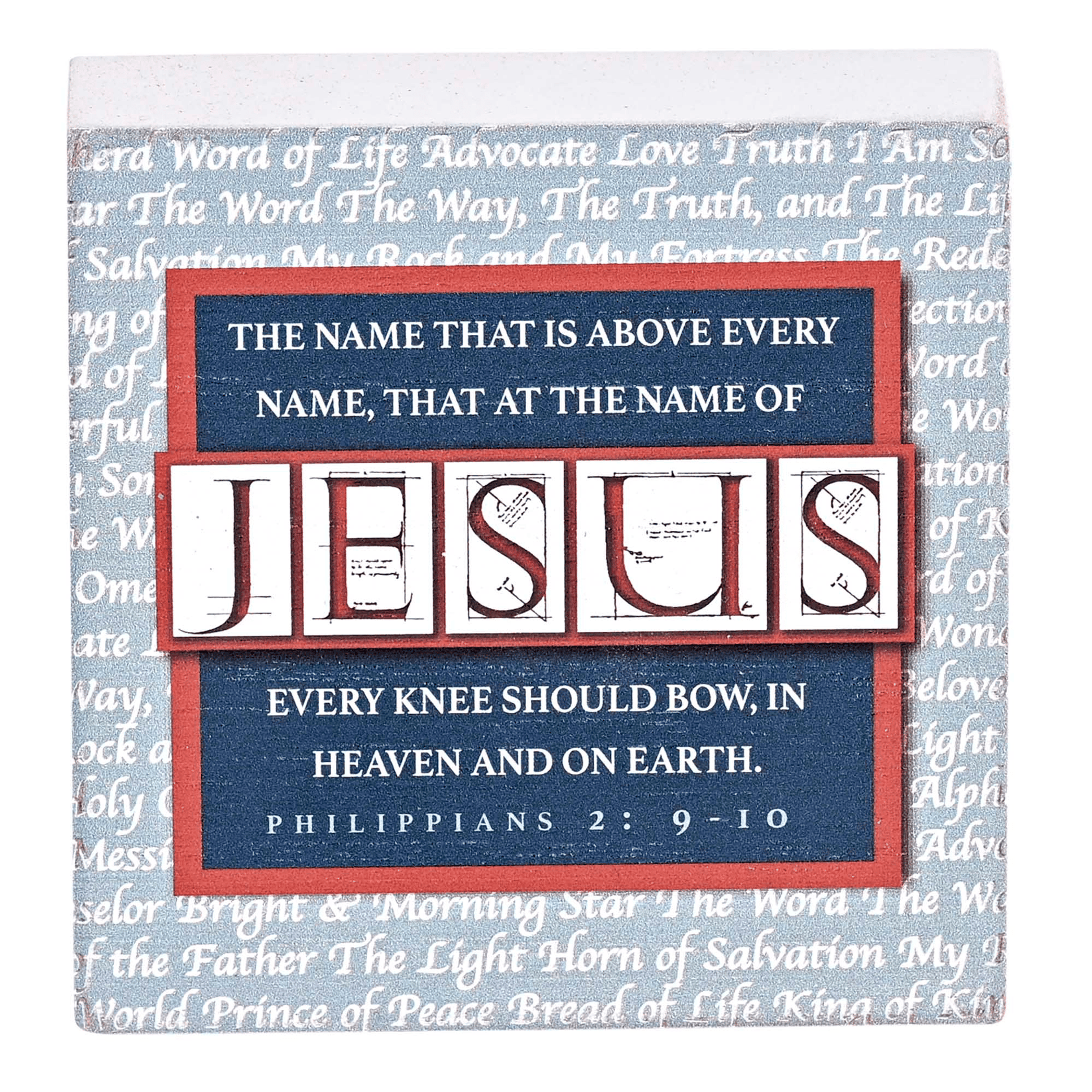 This Small Tabletop Plaque Features Philippians 2:9-10: The Name That Is Above Every Name, That At The Name of Jesus Every Knee Should Bow, In Heaven And On Earth. Plaque Measures 3 x 1 x 3 And Can Sit On Tabletop. Solid Plaque Has White Wash Finish, Made Of MDF Wood.