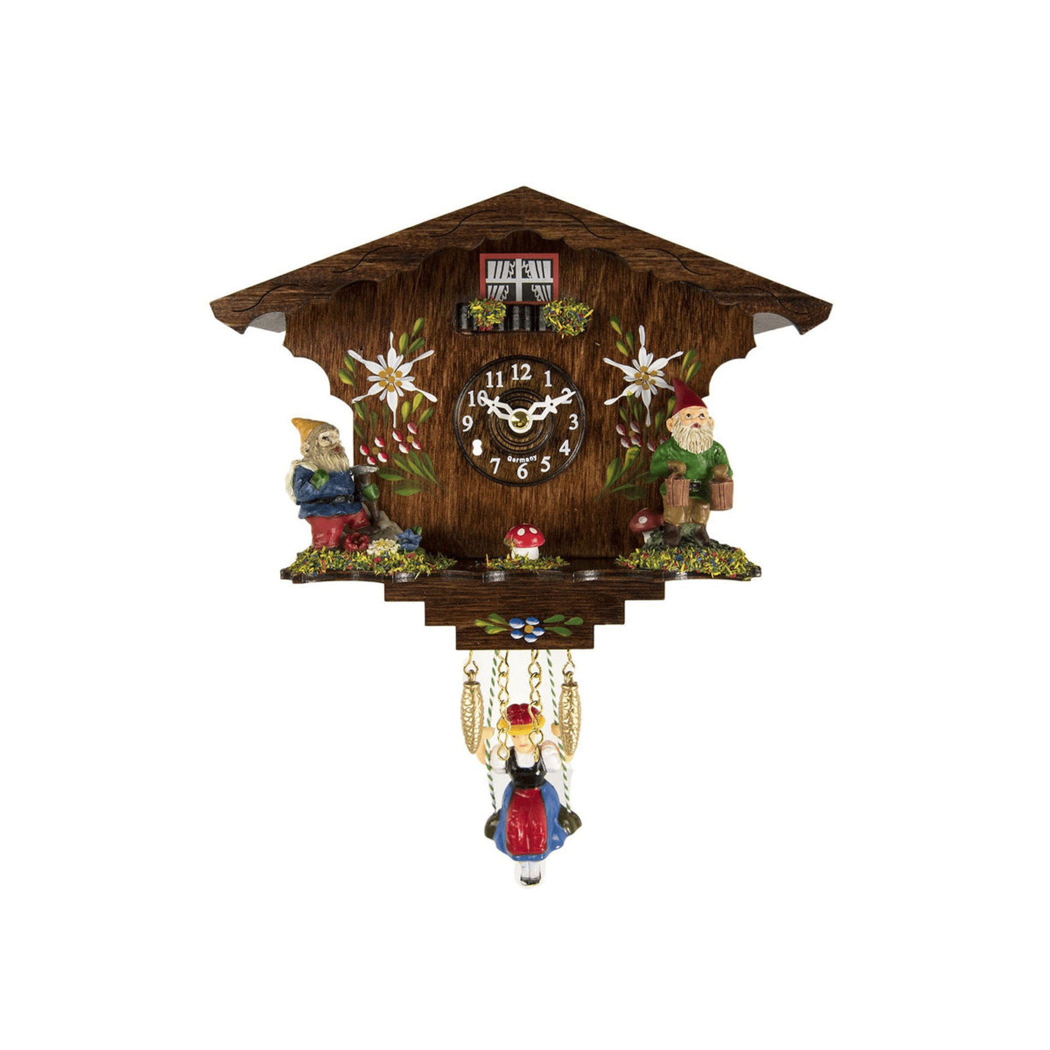Adorable Annaliesse swinging to her hearts content is the winning theme of this quartz time only cuckoo clock. Why not decorate your space and be filled with the cheer she spreads?